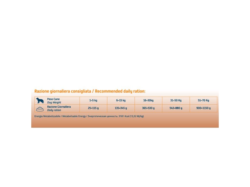 Metabolizovaná energia: 3181 kcal/kg – 13,32 MJ/kg.