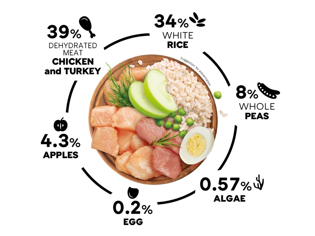 Zloženie: Dehydrované kuracie a morčacie mäso* (39 %), biela ryža* (34 %), kurací a morčací tuk*, celý hrach* (8 %), hydrolyzované kuracie mäso* (3 %), minerály, dehydrovaná repná dužina* (1 %), pivovarské kvasnice*, dehydrované riasy* (zdroj DHA) (0,57 %), dehydrovaná jablková dužina* (0,5 %) (ekvivalent 4,3 % čerstvých jabĺk), dehydrované vajce* (0,2 %), mannan-oligosacharidy MOS* (0,1 %), fruktooligosacharidy FOS* (0,1 %), chondroitín (900 mg/kg), glukozamín (813 mg/kg), drožďový extrakt* (prírodný zdroj nukleotidov): 0,09 %, Yucca schidigera*. *Prírodné zložky.
